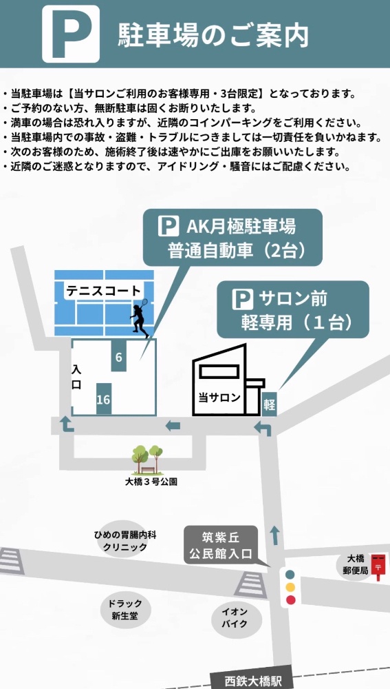 | 駐車場 | ◉無料駐車場3台 【軽自動車1台/普通自動車2台】 ◉有料パーキング 徒歩5分圏内 |